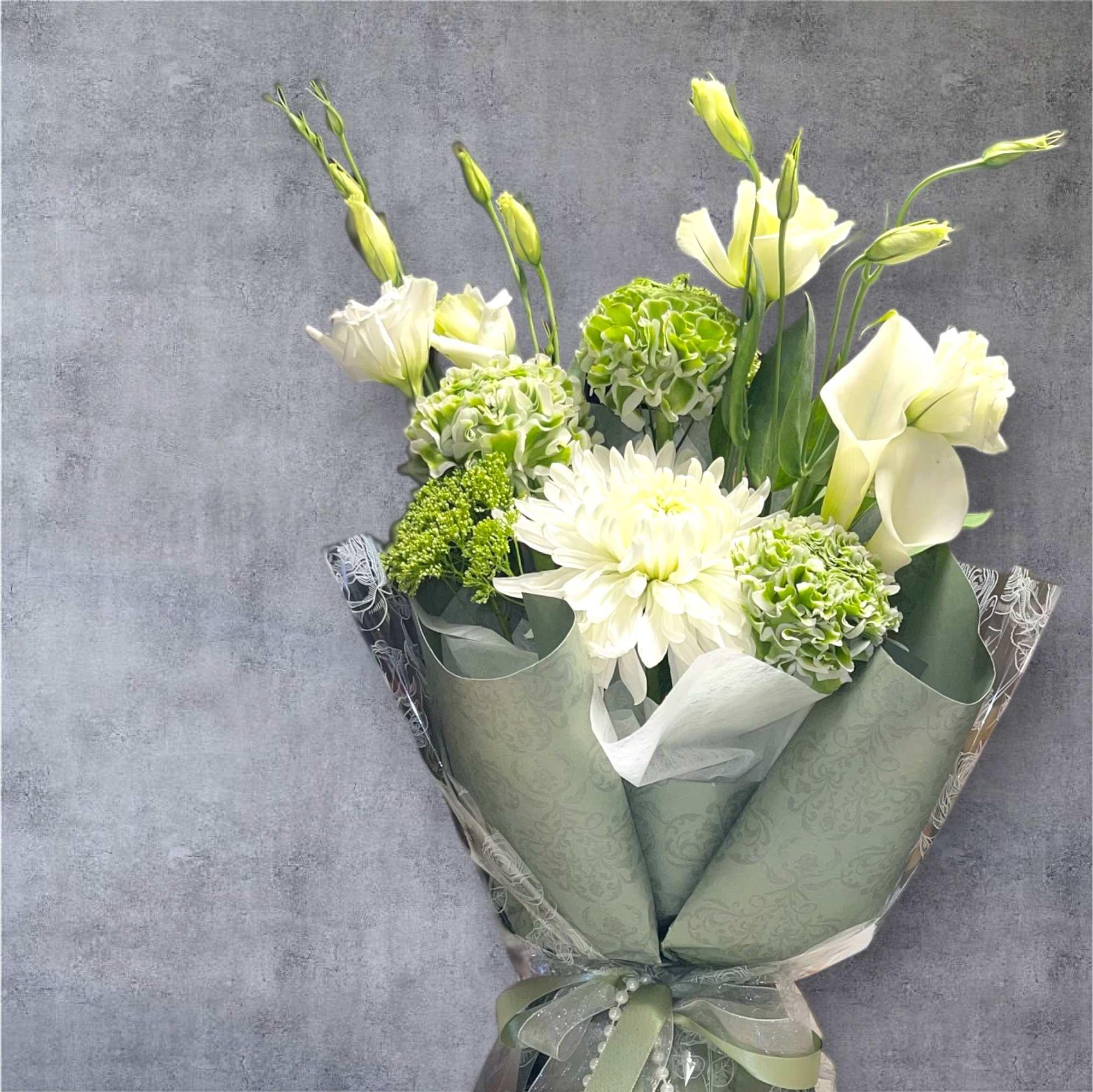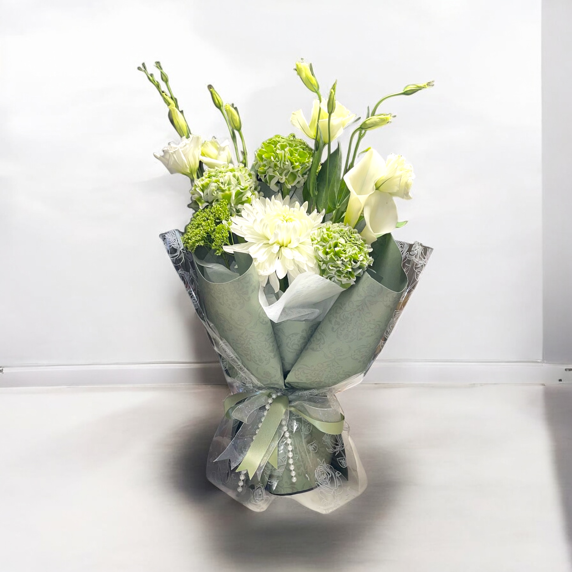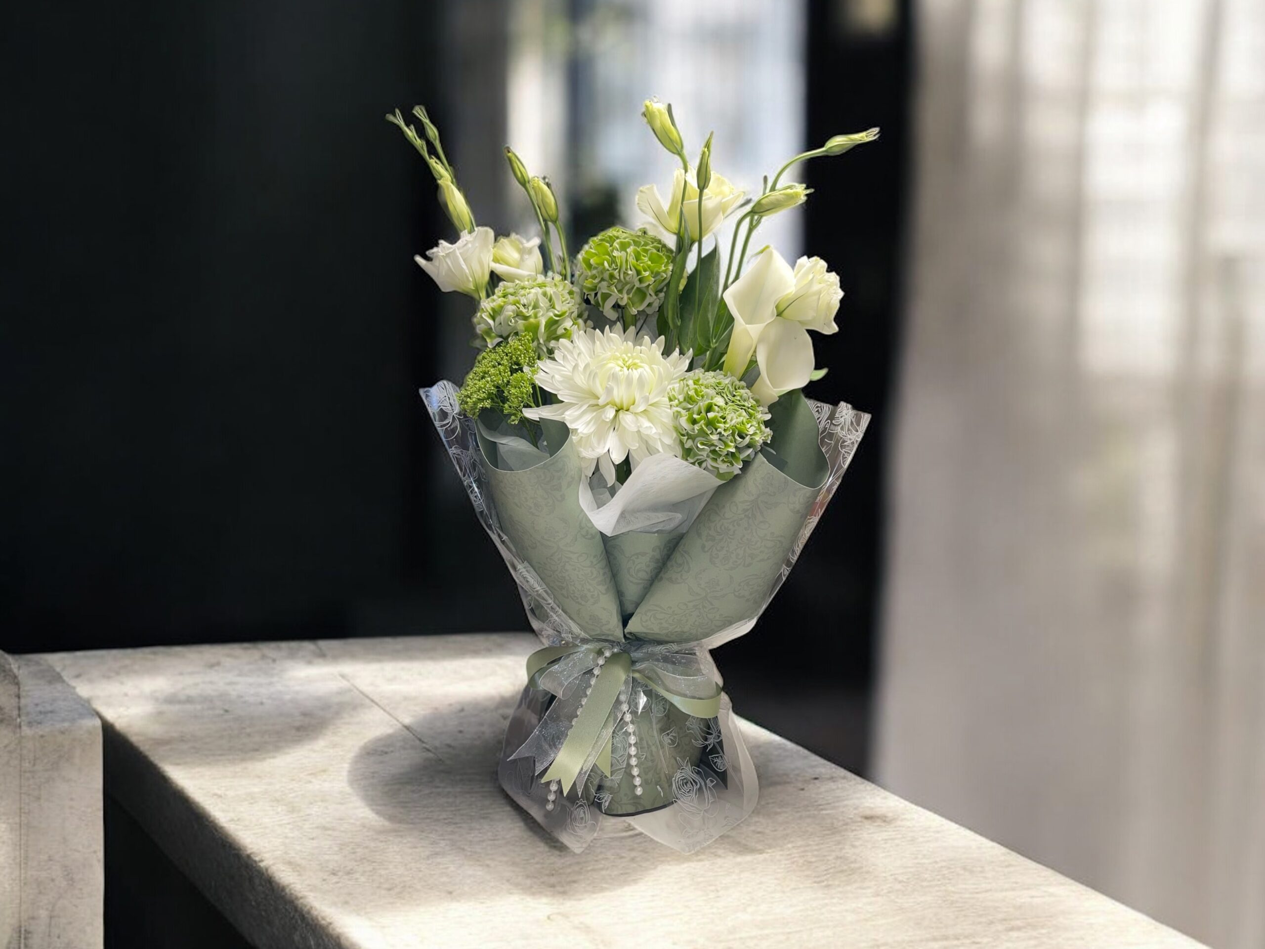 Elegant green-and-white composition wrapped in soft green paper with a satin ribbon and a delicate pearl strand. Inside, a floral foam base soaked with water and flower food keeps the flowers fresh and vibrant for many days — no vase or extra care needed. Just unwrap and enjoy!