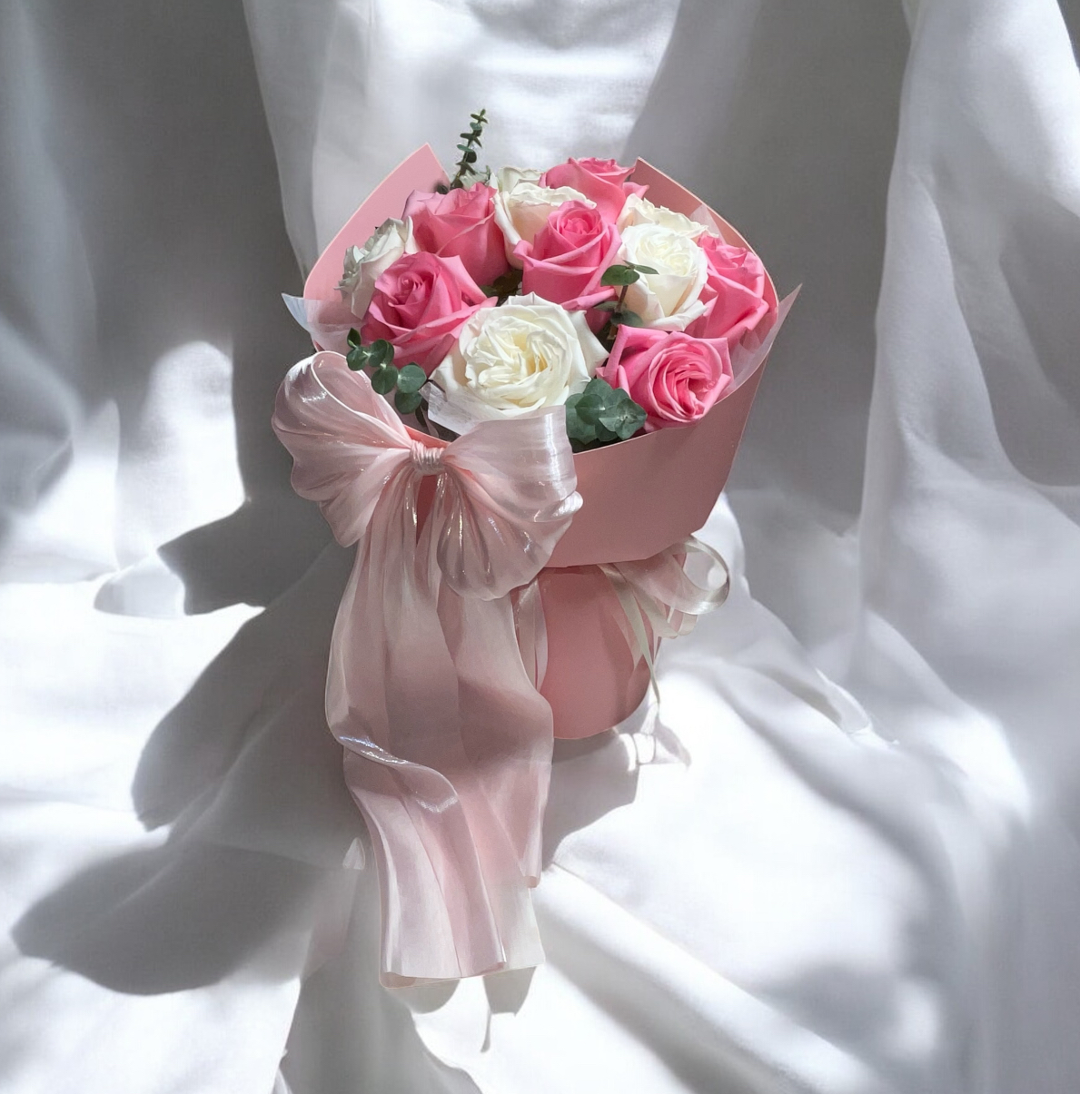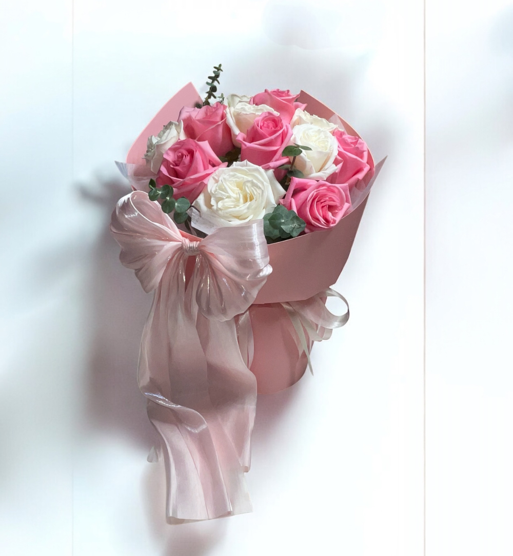 This style has become a modern floral favorite — classic, graceful, and perfect for gifting. The combination of pastel roses and fresh eucalyptus adds natural texture and a soft garden-inspired feel.