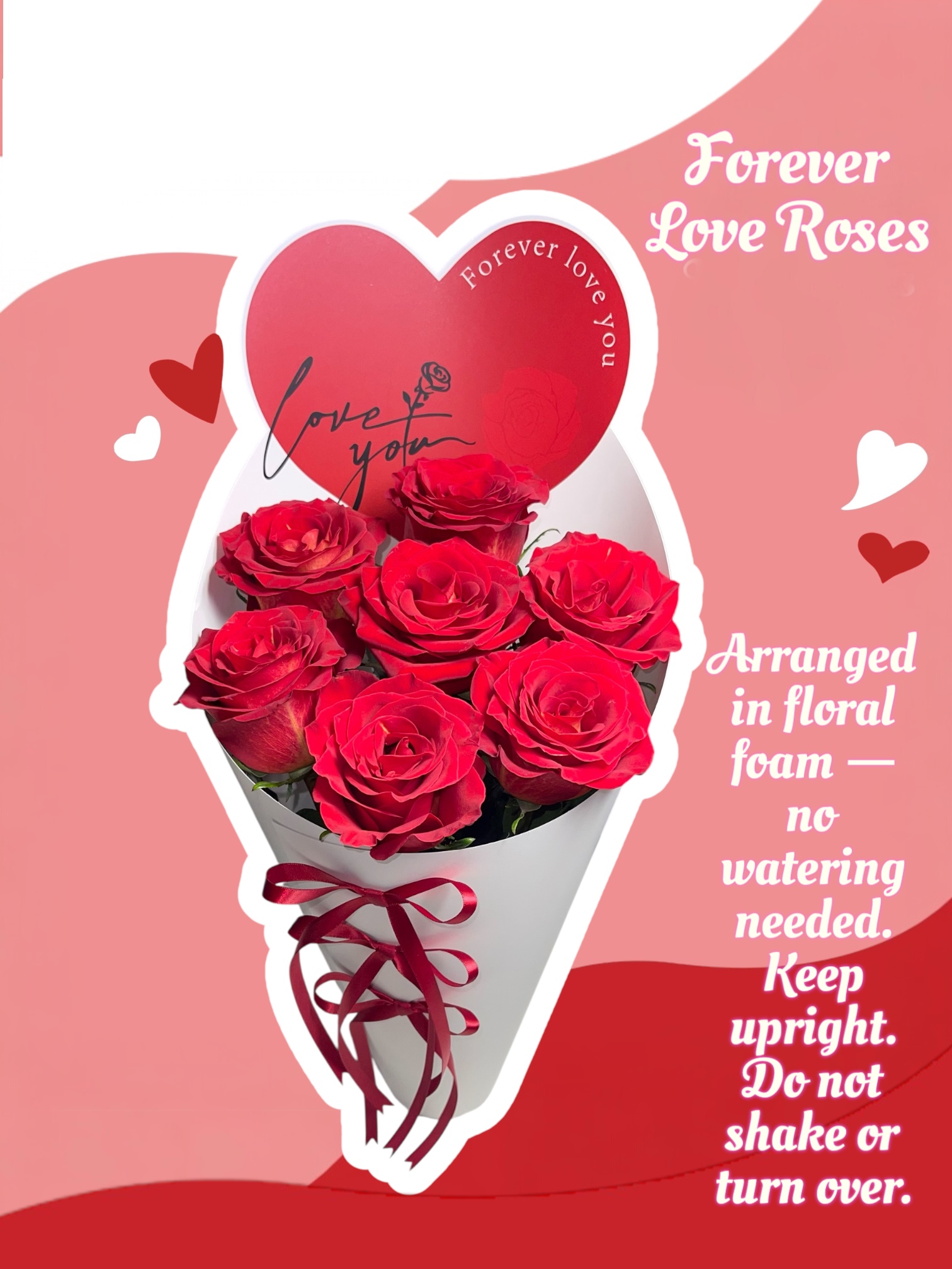 The flowers are set in professional floral foam, which already contains everything needed to keep the roses fresh. No watering or maintenance is required, making this bouquet perfect for effortless gifting and display.