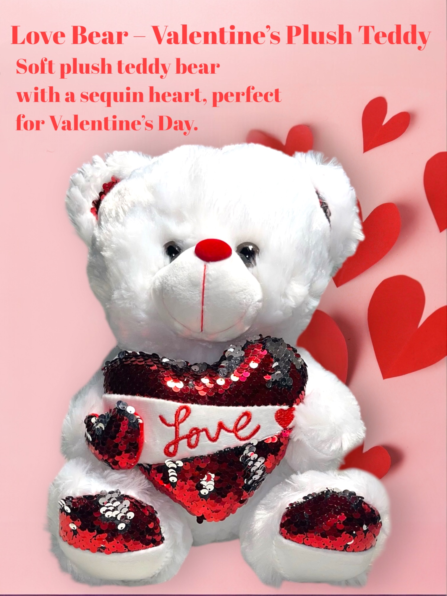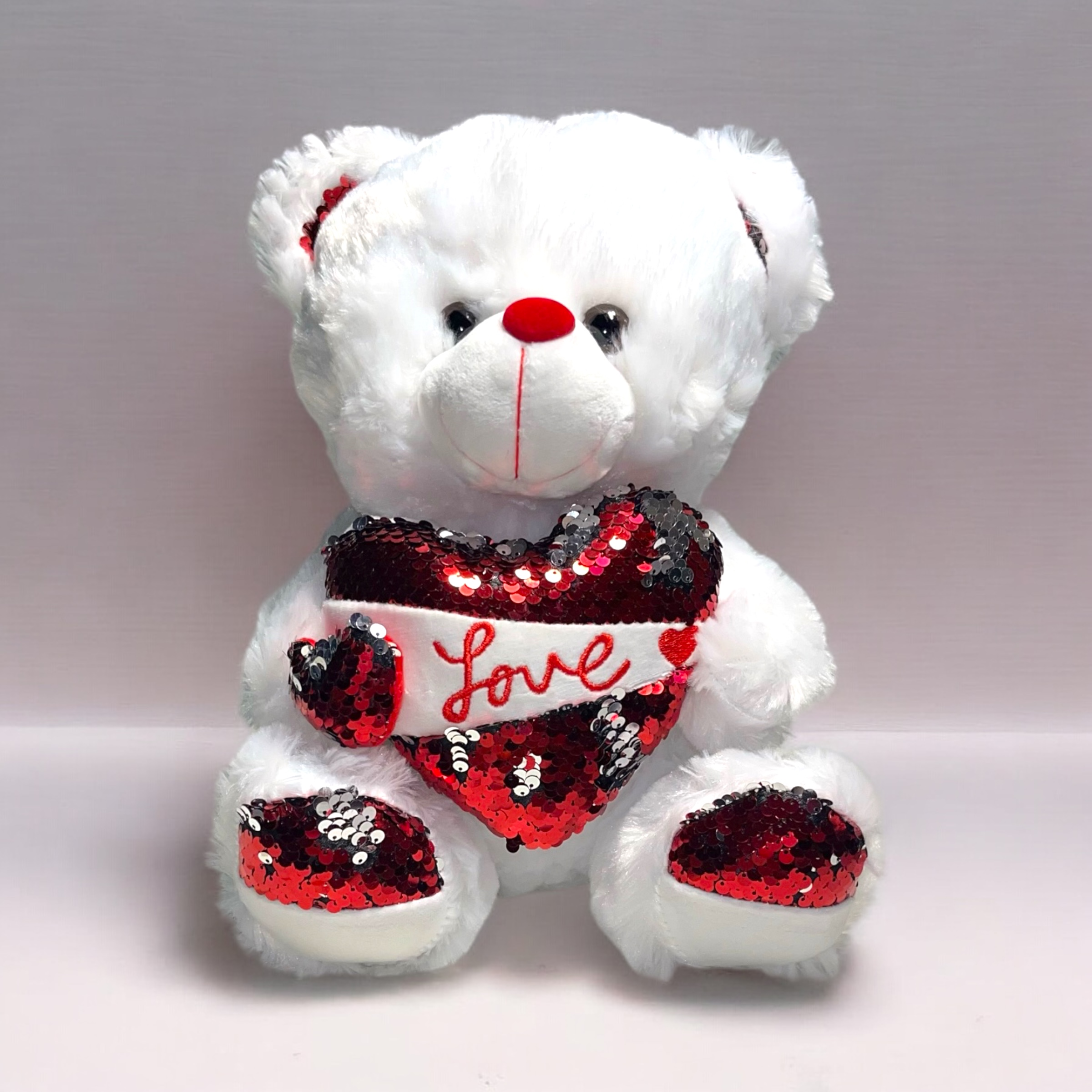 A soft and cuddly plush teddy bear designed especially for Valentine’s Day. Featuring a sparkling sequin heart with the word “Love,” this teddy is a timeless romantic gift that pairs perfectly with flowers or chocolates.