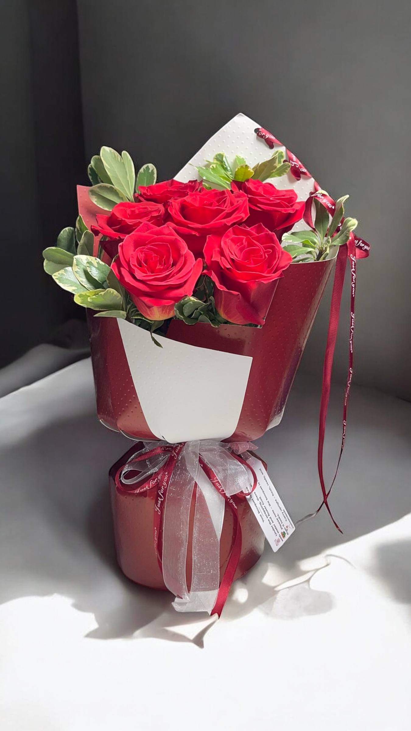 This elegant bouquet features six fresh red roses, beautifully arranged with greenery and wrapped in a modern red designer paper, finished with a soft decorative ribbon. A timeless and romantic floral gift, perfect for Valentine’s Day, anniversaries, birthdays, date nights, or a spontaneous “just because” surprise.