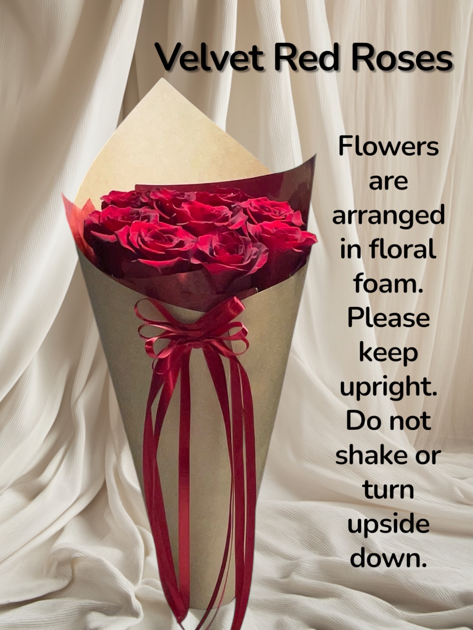 Velvet Red Roses is a sophisticated bouquet designed in a modern, quiet-luxury style. Fresh premium red roses are wrapped in natural kraft paper with a deep lacquer-red inner layer, creating a beautiful contrast between minimal natural tones and rich velvet petals.